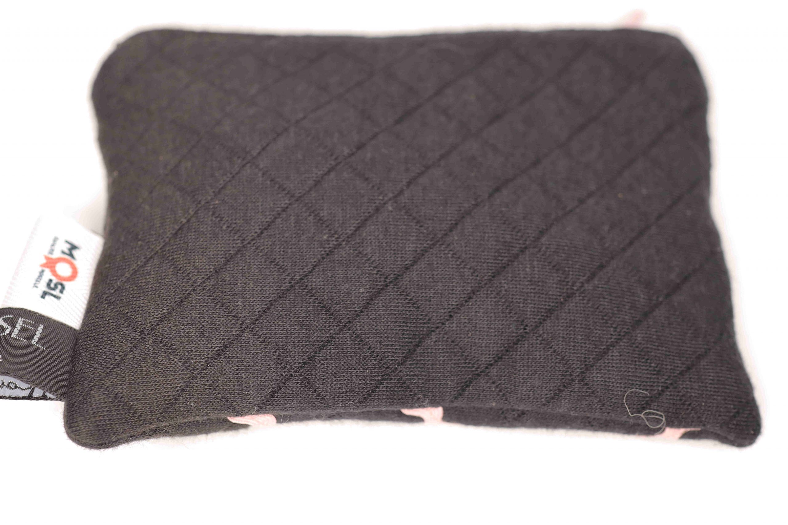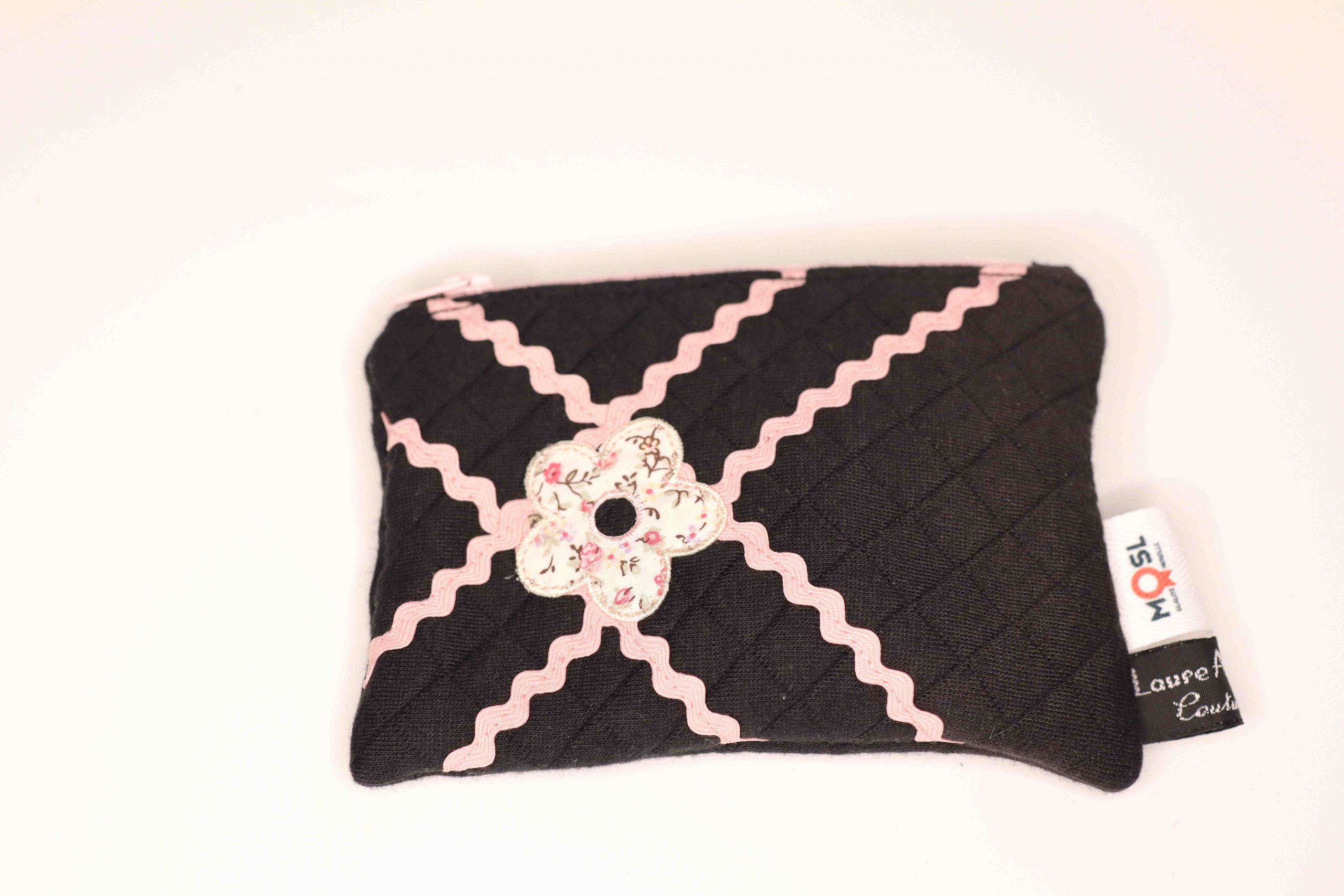 This elegant black coin purse with pink bands is beautiful and convenient. It is fully lined with a black cotton fabric and finished off with a pink zipper.